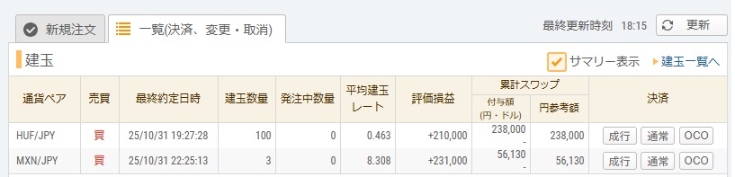 ハンガリーフォリント、メキシコペソ共に含み益・スワップ共に順調に推移しており、口座全体で大幅なプラスとなっています。